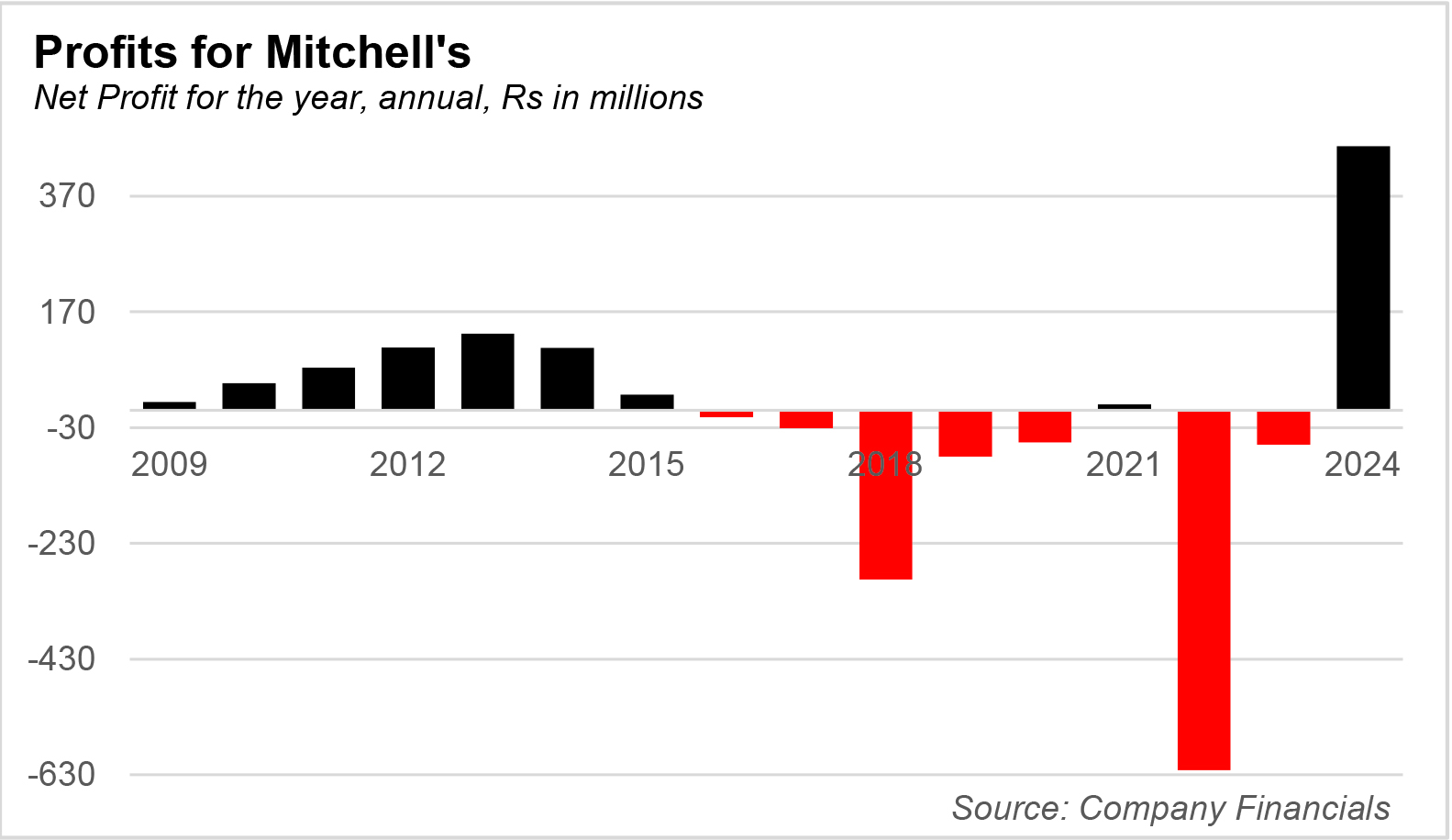 Most of this value was owing to the fact that Mitchell’s was consistently churning profits on a yearly basis. From 2016 to 2023, things started to take a turn for the worst as the company ended up with cumulative losses of Rs 1.1 billion.