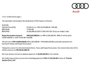 To Naeem Afzal this seemed to be a smoking gun. Up until this entire point, all of the dealings Naeem Afzal had with the dealership was under the letterhead of “Audi Pakistan”. The only time Premier Systems Limited was mentioned was when he made the Rs 1 crore payment. According to Afzal, when he had asked the dealership what Premier was, he claims they had told him that was the name of their importer without clarifying the dealership itself was run by Premier.