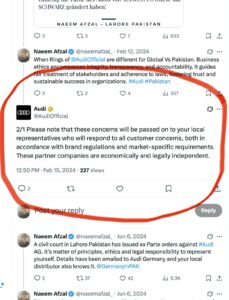 Lady Justice was not the only avenue this customer turned to. Sans money and sans car, Naeem Afzal did the only other thing he could: posting on social media. He became active in groups like Voice of Customers on Facebook which have become the boogeyman for many businesses afraid of getting bad reviews. He started writing emails to Audi AG but received no reply. He took to twitter and began tagging Audi AG with details of the case he had filed against Audi Pakistan and against them as well. Eventually he received confirmation from Audi AG in Germany through a twitter reply and through an email. They said their local partners are completely separate legal and economic entities with no ties to the Audi AG group. They were simply allowed to use the Audi branding because they were displaying their products.