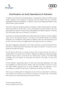 The statement, which interestingly enough has the letterhead of “Premier” along with the Audi logo and no mention of the term Audi Pakistan, is belligerent in tone. While the press release clarifies issues surrounding Premier’s status and relationship with Audi AG, it also alludes to “false and misleading claims” being circulated on social media. It does not specify or get into the dispute with Naeem Afzal but does mention that PECA is a tool at their disposal. Essentially, Premier is trying to beat out the flames that their case had fanned. It was also a clear indication that they were not ready to put this matter aside and reach an out of court settlement. The cases would continue to be pursued.