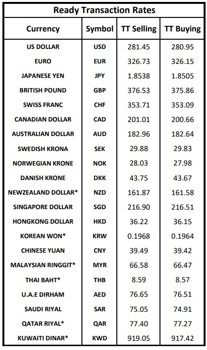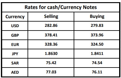 The Treasury & Capital Markets Group of the National Bank of Pakistan (NBP) issued the following Exchange Rates Bulletin on Wednesday.