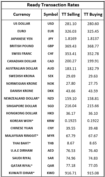 The Treasury & Capital Markets Group of the National Bank of Pakistan (NBP) issued the following Exchange Rates Bulletin on Monday.
