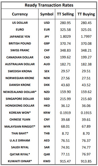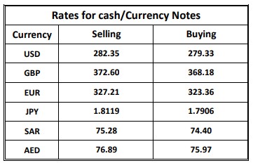 The Treasury & Capital Markets Group of the National Bank of Pakistan (NBP) issued the following Exchange Rates Bulletin on Wednesday.