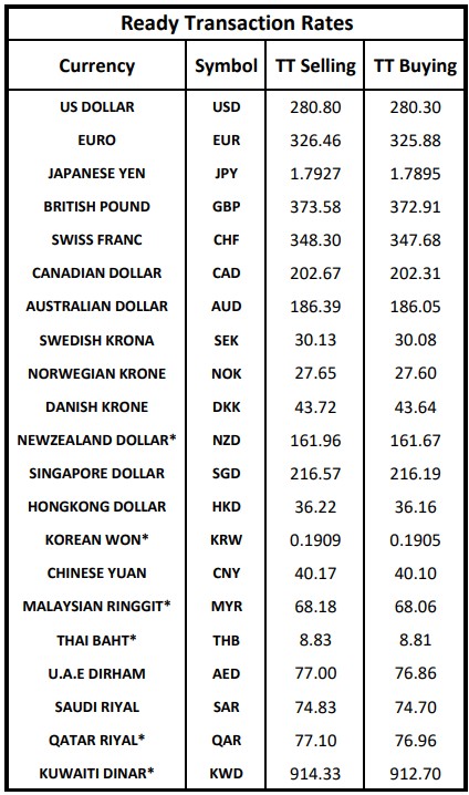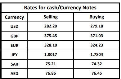 The Treasury & Capital Markets Group of the National Bank of Pakistan (NBP) issued the following Exchange Rates Bulletin on Wednesday.