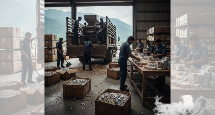The MK-8 machines, known for high-speed cigarette production, were found running alongside auxiliary systems used for packing and branding, indicating the scale of the operation.