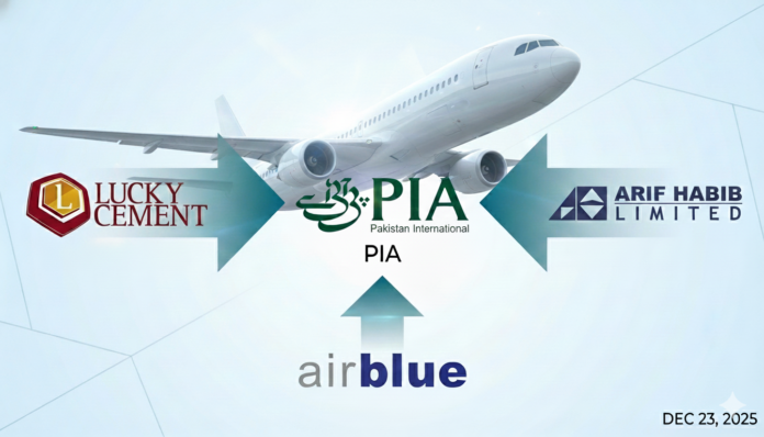 The bidders include two major consortia and one independent airline. The first consortium is led by Lucky Cement Limited, Hub Power Holdings Limited, Kohat Cement Company Limited, and Metro Ventures (Private) Limited, while the second consortium consists of Arif Habib Corporation Limited, Fatima Fertiliser Company Limited, City Schools (Private) Limited, and Lake City Holdings (Private) Limited. The third bidder is Air Blue (Private) Limited, which is competing independently.