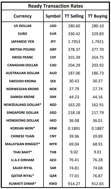 The Treasury & Capital Markets Group of the National Bank of Pakistan (NBP) issued the following Exchange Rates Bulletin on Tuesday.