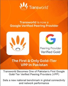 Islamabad – Transworld, Pakistan’s leading Tier-1 connectivity and data solutions provider, is proud to announce that it has officially achieved Gold tier in the Google Verified Peering Provider (VPP) program, becoming one of the first and only providers in Pakistan to attain this prestigious status.