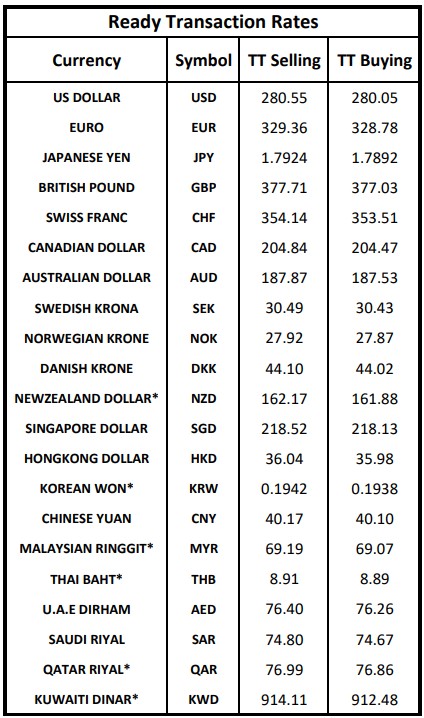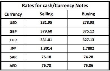 The Treasury & Capital Markets Group of the National Bank of Pakistan (NBP) issued the following Exchange Rates Bulletin on Wednesday.