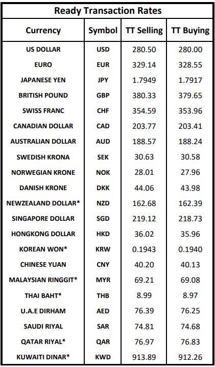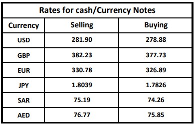 The Treasury & Capital Markets Group of the National Bank of Pakistan (NBP) issued the following Exchange Rates Bulletin on Tuesday.