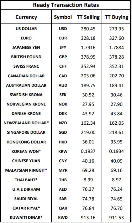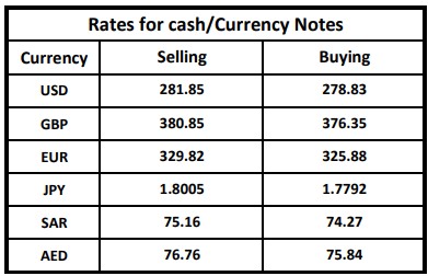 The Treasury & Capital Markets Group of the National Bank of Pakistan (NBP) issued the following Exchange Rates Bulletin on Wednesday.