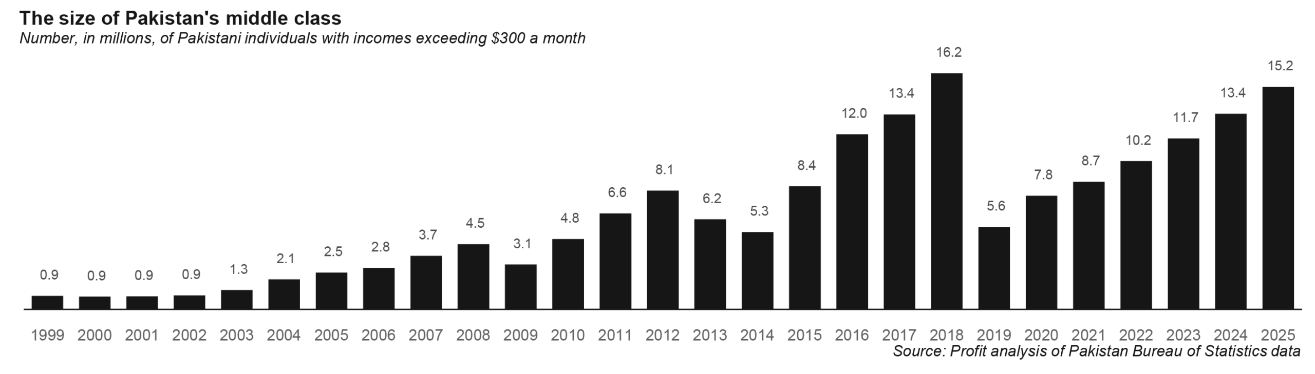 This three-year gap is the longest gap to have occurred in the collection and dissemination of this kind of data since at least 1990. Not coincidentally, the years for which data are missing happen to also be the worst years for the Pakistani economy since the aftermath of the 1971 war, as measured by GDP growth, when measured in nominal US dollar terms.