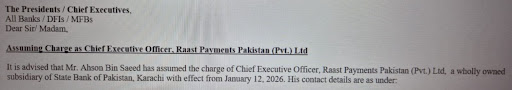 Ahson bin Saeed has formally assumed charge at SBP Raast Payment Systems (Private) Limited, the entity responsible for operating and scaling Pakistan’s instant payment system Raast, as chief executive officer on January 12, 2026.